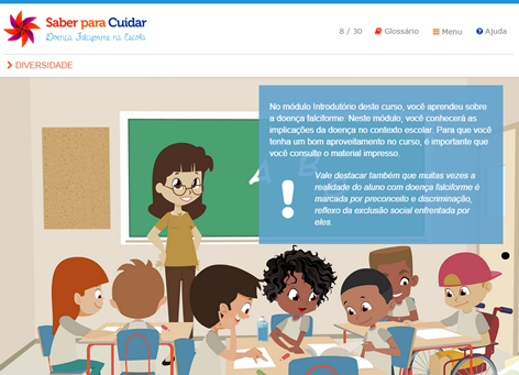 O curso a distância consiste em 30 horas/aula divididas em 45 dias. Os temas “Diversidade no contexto escolar”, “Peculiaridades da doença falciforme no contexto escolar” e “Articulação em redes de apoio” são dispostos em três módulos, além do módulo introdutório.